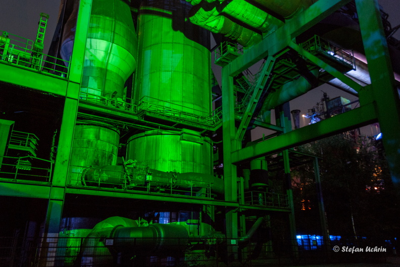 Hochofen 5 bei Nacht. Beleuchtung noch im Probebetrieb